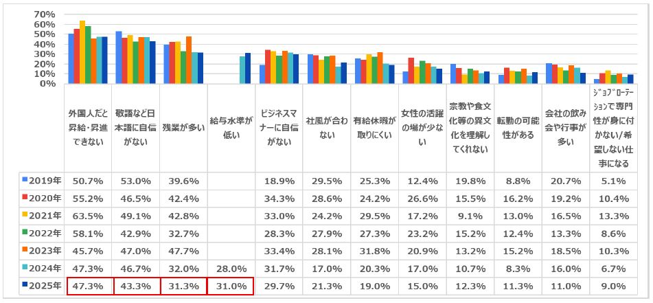 半数近く(47.3%)が「外国人だと昇給・昇進できない」と回答。次いで「敬語など日本語に自信がない」(43.3%)、そしてほぼ同率で「残業が多い」(31.3%)、「給与水準が低い」(31.0%)という結果になりました。