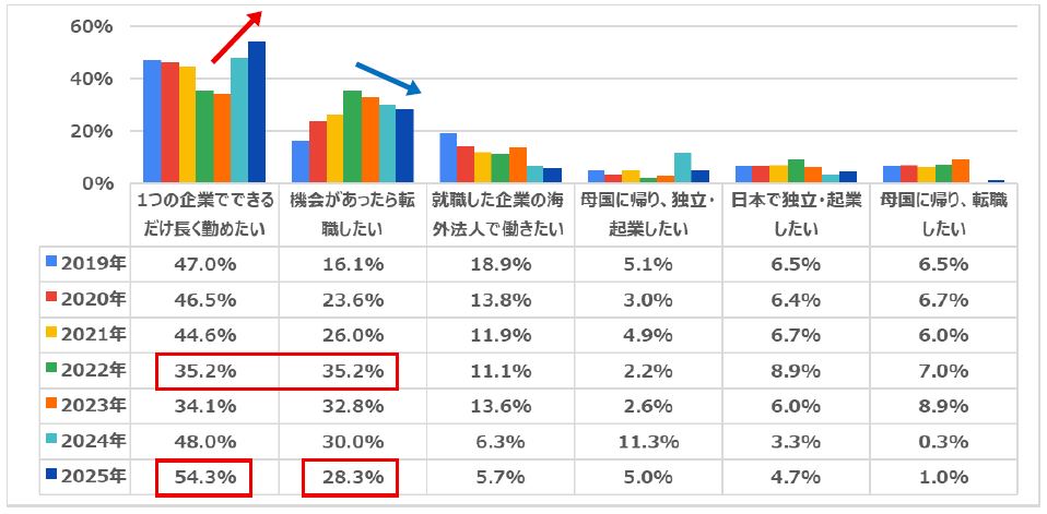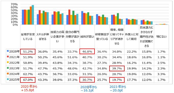 2020年に約5割(46.8%)だった「給料が高い」は16.1pt減少しました。また、「将来、母国に帰ってキャリアが活かせる」も2023年の39.7%をピークに減少しています。
