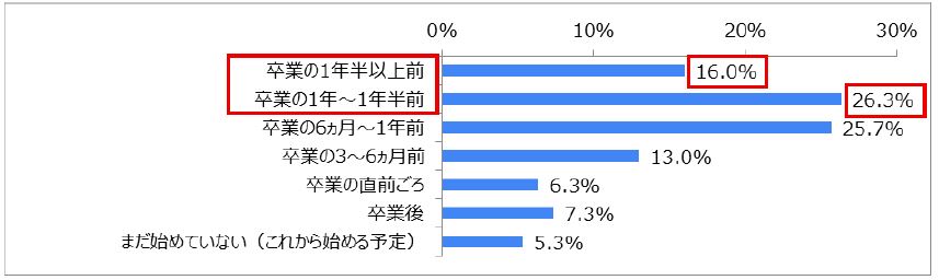 「卒業の1年~1年半前」(26.3%)と「卒業の6ヵ月~1年前」(25.7%)に就職活動を始めた留学生が多いことがわかりました。また、卒業の1年以上前と回答したのは、42.3%(26.3%+16.0%)となり、日本人学生と同様に、早期に開始する留学生が多いことがわかりました。