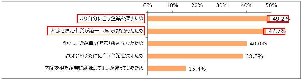 「より自分に合う企業を探すため」(49.2%)と「内定を得た企業が第一志望ではなかったため」(47.7%)がともに約半数となりました。