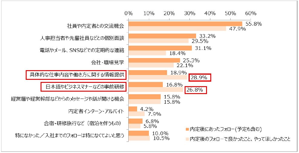 内定後のフォローで良かったこと、やってほしかったことも同時に聞いた結果、「社員や内定者との交流機会」(47.9%)、「人事担当者や先輩社員などとの個別面談」(29.5%)、「具体的な仕事内容や働き方に関する情報提供」(28.9%)、「日本語やビジネスマナーなどの事前研修」(26.8%)となりました。