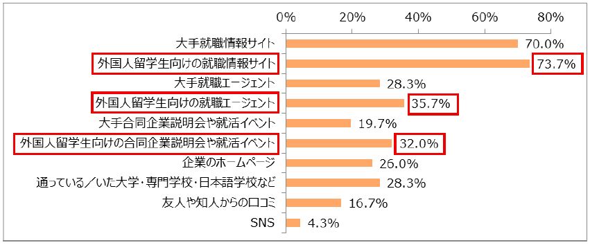 「外国人留学生向けの就職情報サイト」(73.7%)、「大手就職情報サイト」(70.0%)がともに7割を超えました。なお、就職情報サイト、就職エージェント、合同企業説明会や就活イベントは、どれも“外国人留学生向け”が高い割合となりました。
