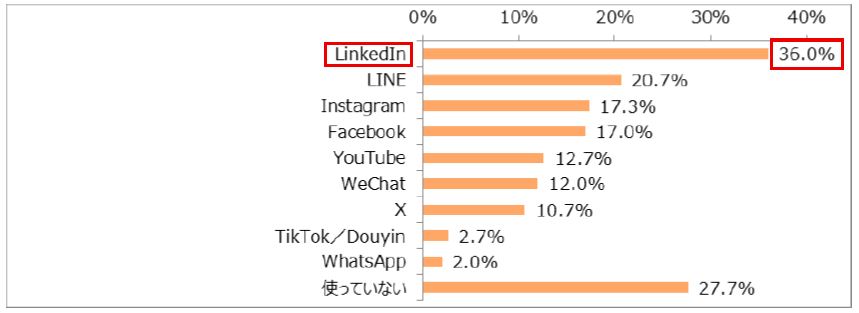 「LinkedIn」(36.0%)が最も多く、4割近くが回答。「LINE」(20.7%)、「Instagram」(17.3%)、「Facebook」(17.0%)も約2割となりました。その一方で、SNSを「使っていない」と回答した留学生も約3割(27.7%)いることがわかりました。