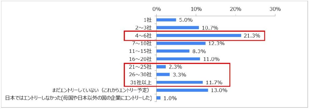 最も多かったのが「4~6社」(21.3%)でした。また、21社以上と回答したのが17.3%(2.3%+3.3%+11.7%)となり、約2割の留学生が日本人学生と同様に多くの企業にエントリーしたことがわかりました。